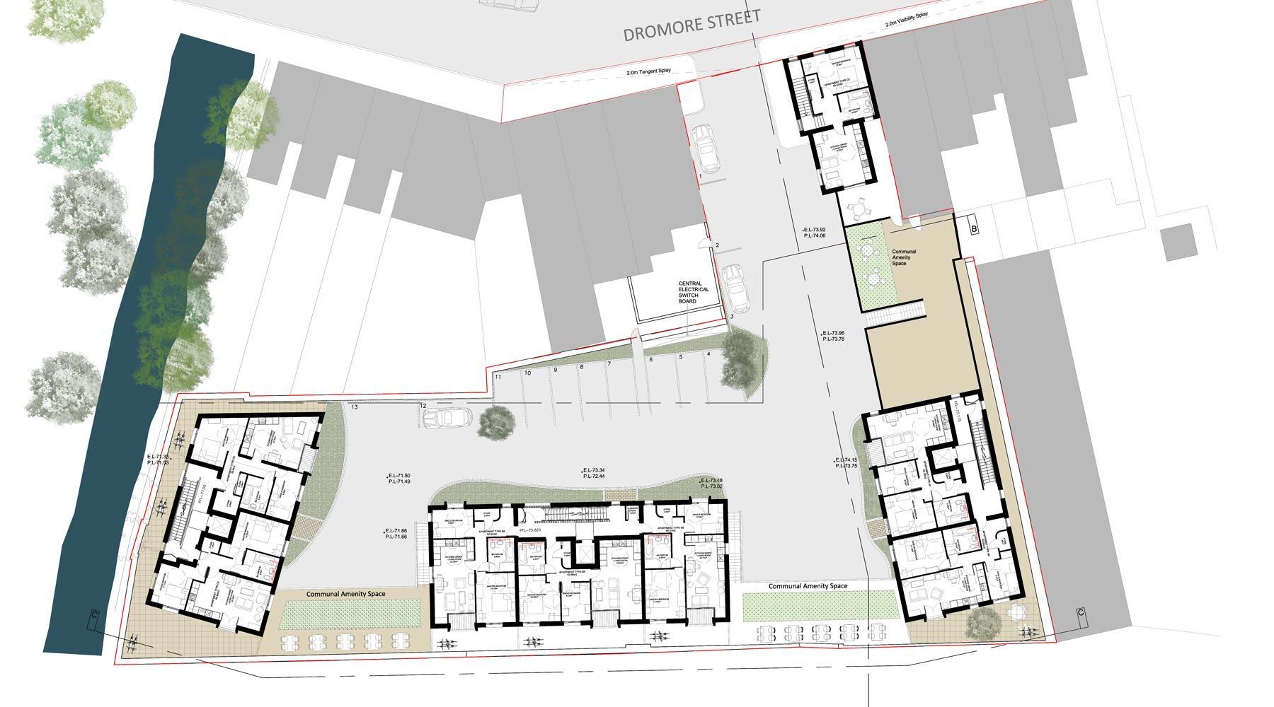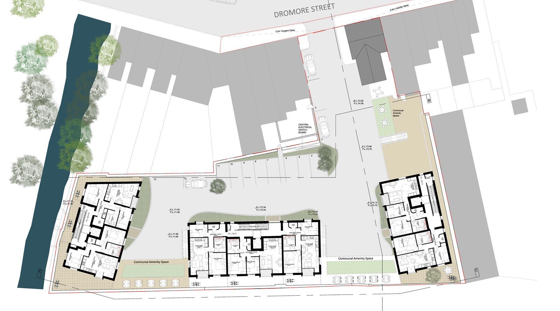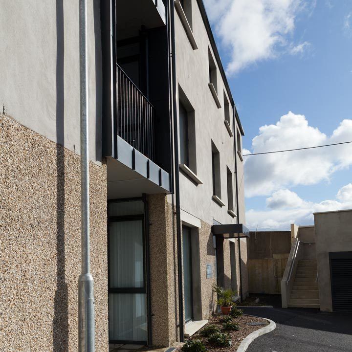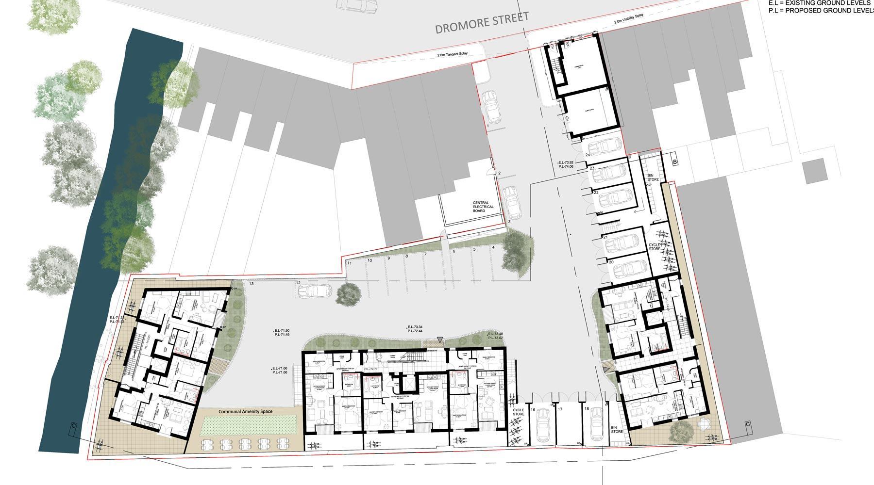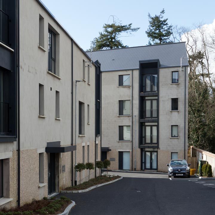 Located in a former builders yard site on the edge of the market town of Ballynahinch the scheme was for 24 general needs 2 bedroom apartments and one street frontage commercial unit.