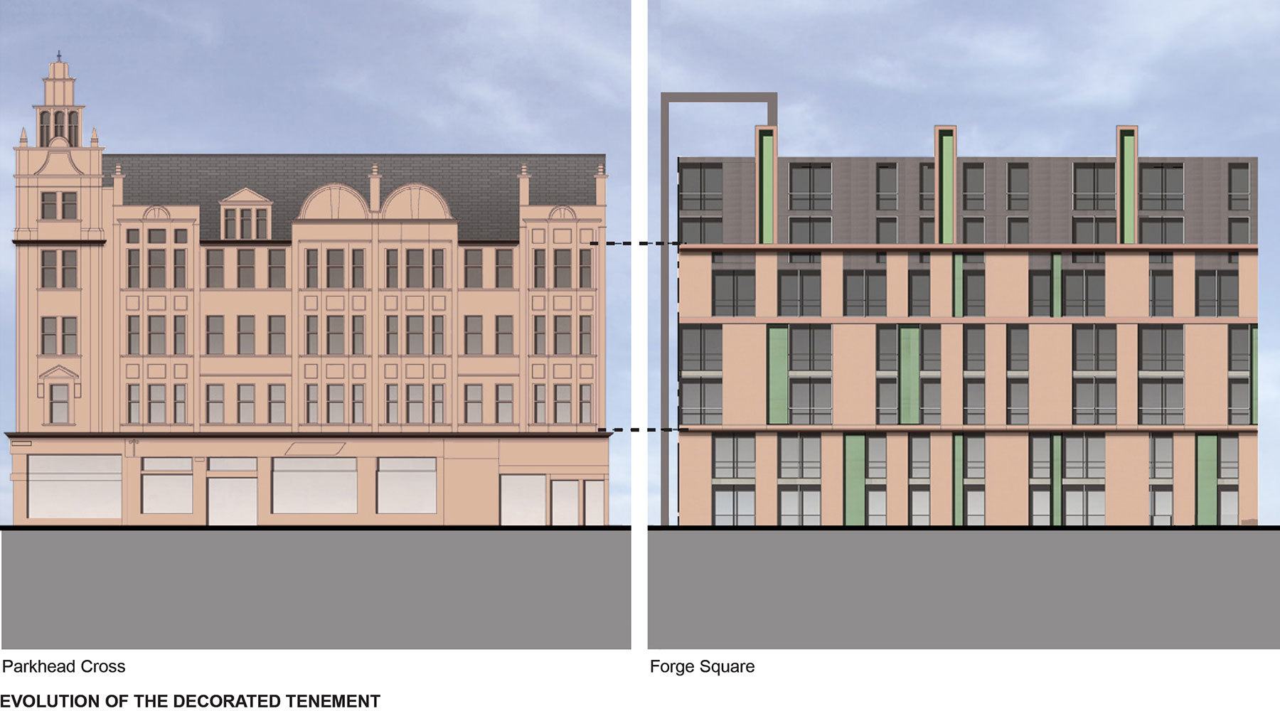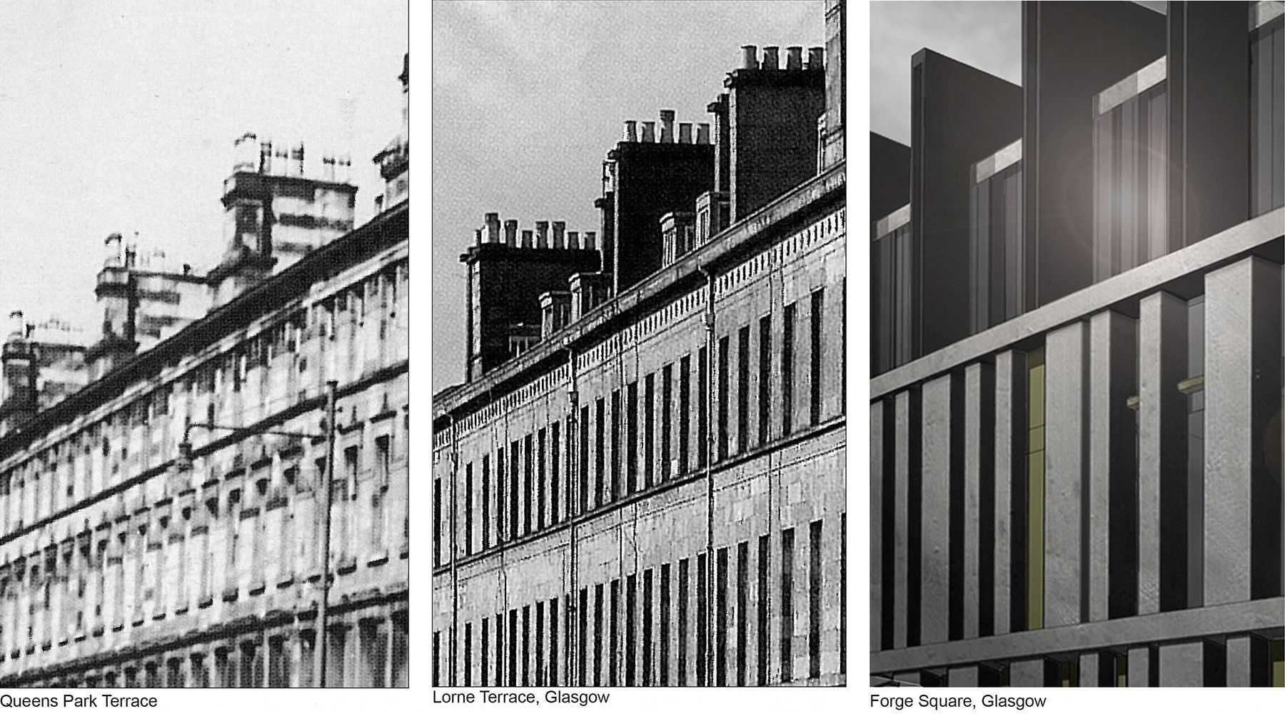 Consistent with the 19th Century Georgian and later Victorian traditions a small number of components and a high degree of repetition and modularity meant that construction costs could be kept down while allowing high quality stone finishes to be used. Subtle variations in the design of standard components ensured variety and interest in the elevational treatment with the result that large urban scale tenements and blocks, crescents or grand terraces were cost effective to build. It is in this tradition that RMI developed the Forge Square scheme, where the use of high quality finishes would help to create a rich and secure environment and the new homes were cost effective to build and affordable, particularly within the depressed housing conditions of Glasgow’s east end.