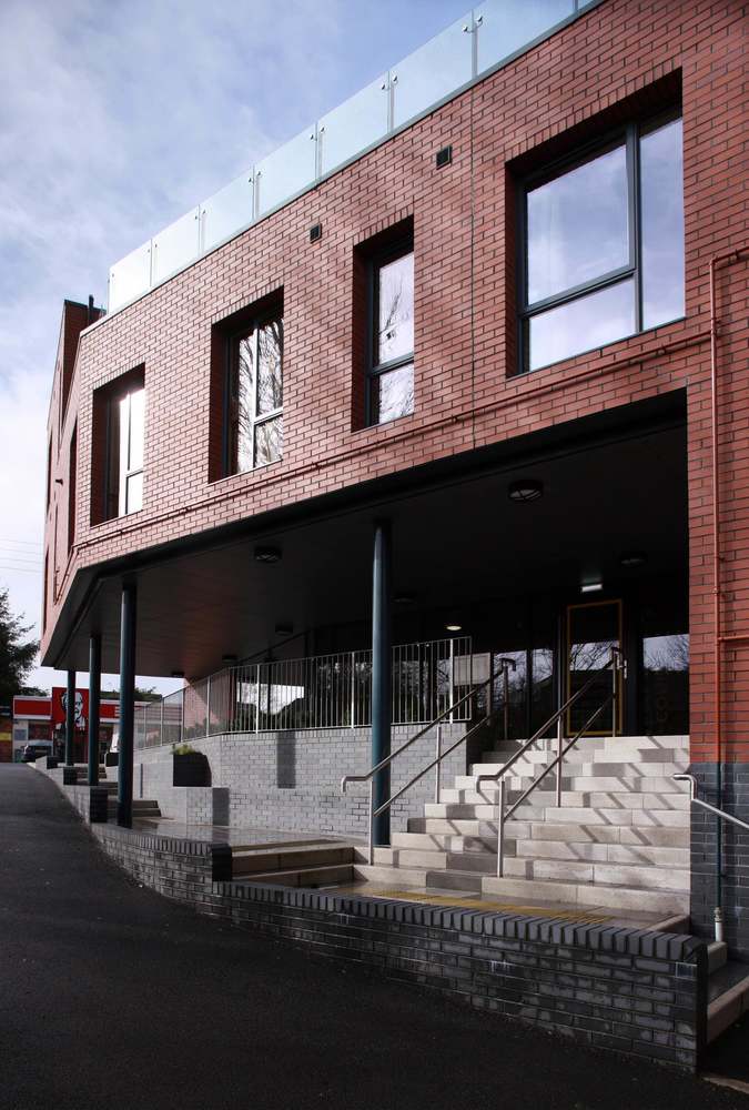The building form responds to the site constraints and a simple crank along the entrance elevation creates visual interest whilst reinforcing the main entrance. Further extrusions are emphasised, including the lift core and the building bookend along the Antrim Road elevation. The intention was to create a visual marker and point of interest along the Antrim Road.