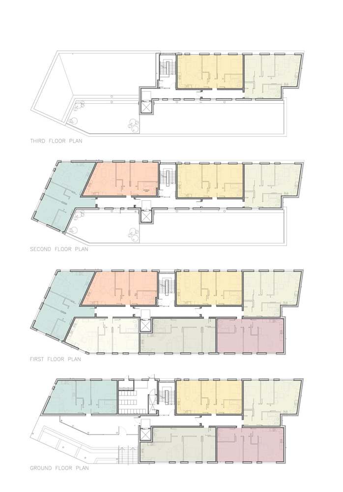 Our initial concept was to create a sculptural form with deep openings recessed into the heavy masonry. A blue engineering brick plinth extends along the lower part of the site to reinforce the buildings linear form and reduce the overall building massing. Large elements of masonry were removed to create a covered entrance canopy that addresses the Antrim Road and extends into a generous glazed internal lobby encouraging social interaction between the residents.