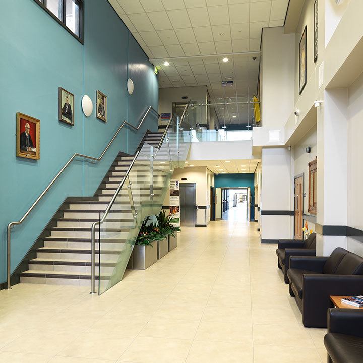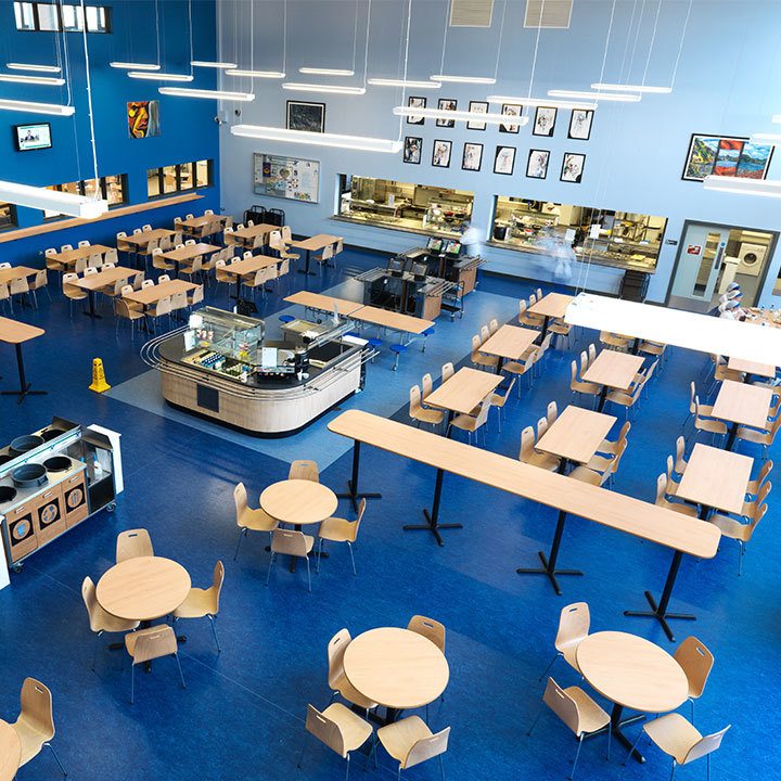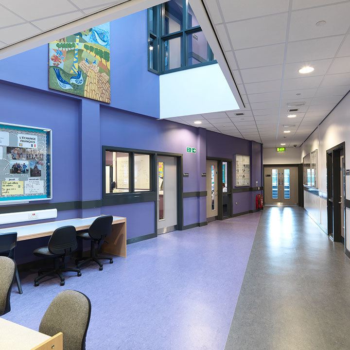 The social zone at the main entrance which includes the linked assembly hall and multi-purpose hall, the school meals area, staff rooms and sixth form centre;