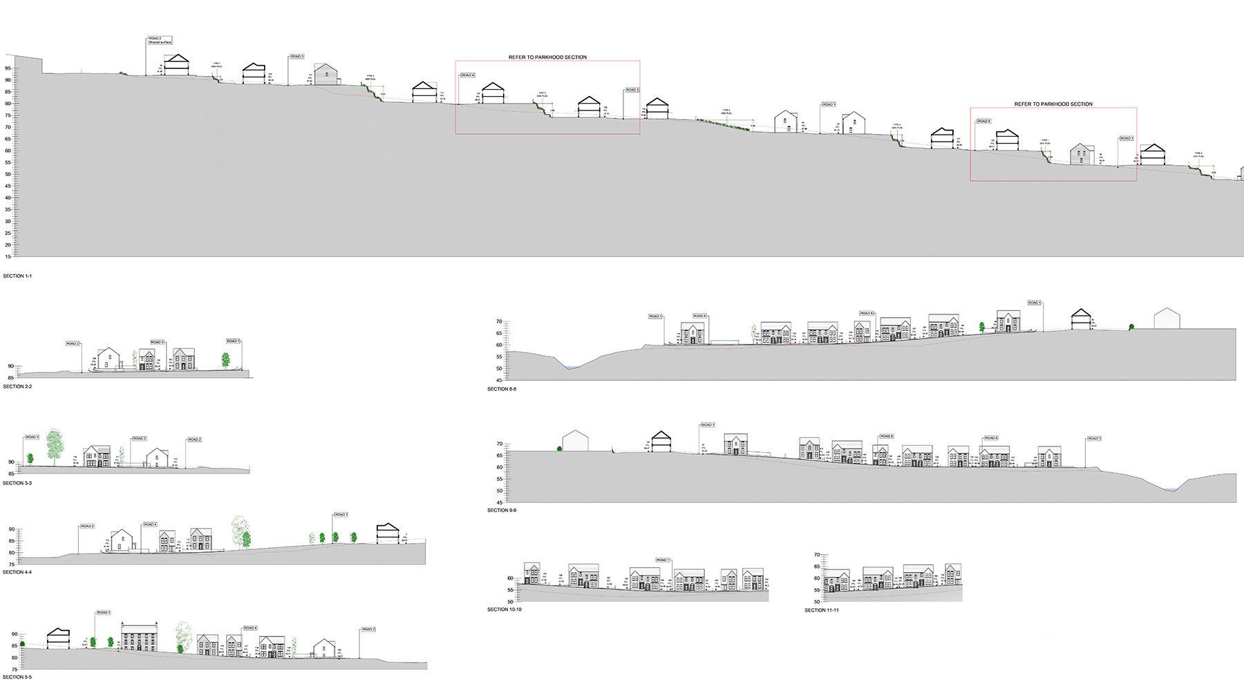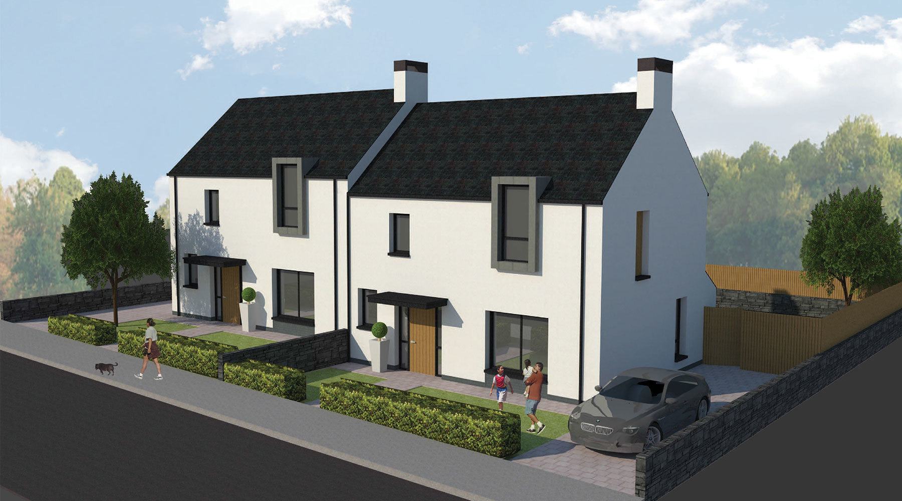 In 2015 Braidwater commissioned RMI to develop detailed proposals for a 220 unit housing scheme on a 34 acre greenfield site at Belt Road in Derry. This included a mix of houses bungalows and apartments. RMI developed up the detailed design and housetypes to suit the challenging topography on the basis of the concept masterplan which was awaiting approval at the time. Though the concept masterplan fixed the maximum density of 220 units on the site in practice it was a considerable challenge to achieve this given the physical constraints on the site. Some of the key challenges included working out finished floor and road levels to achieve level access to houses, minimising retaining structures (and cost), achieving adequate drainage falls and creating useable open space in the challenging topography.