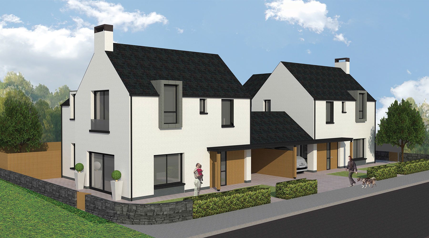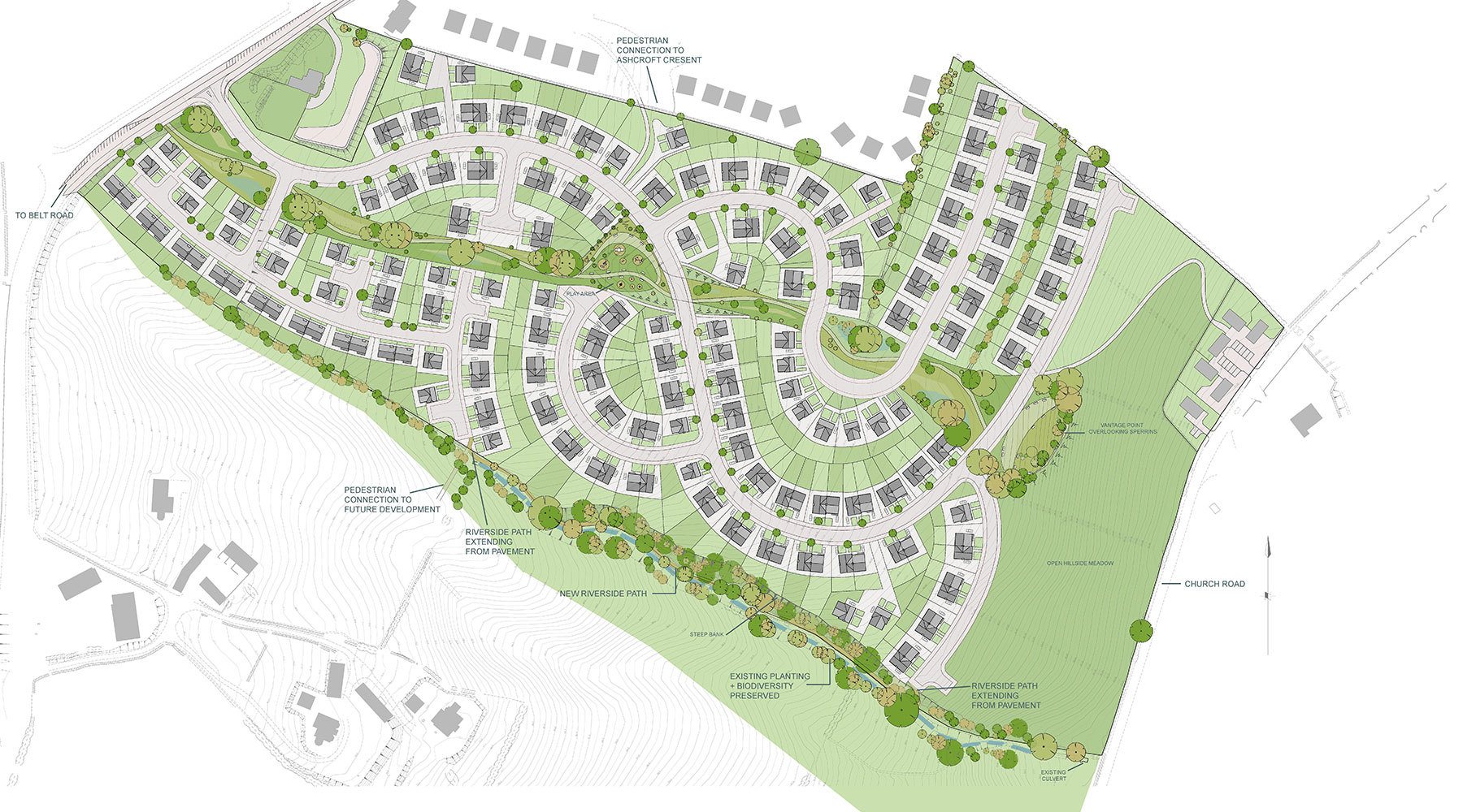 A key part of the masterplan was creation of a central greenway running through the site from north to south to provide open and easily accessible recreation space for all residents and which would provide a green link between Belt Road and a south facing landscaped hill to the south of the site. This green link enabled the retention of mature trees which lined the former field boundary and which has now provided an important part of the character of the new development. Due to the physical site constraints impacting on the available development space and the requirement to achieve 220 units there had to be some reduction in the extent of the greenway.